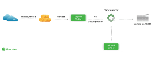 Vegetal concrete is made from refused plant matter such as hemp stalks, straw, corn stalks and so on. Obviously, when this plant matter was still a part of a plant that was rooted and irrigated, the plant absorbed CO2 from the air and converted it to long-chain phytocompounds such as cellulose, pectin and so on, with the energy offered by sunlight. In fact, for every 1g of carbon fixated in a plant 3.66g of carbon dioxide is absorbed from the air. As an example, it is found that roughly 43.4% of the mass of a rice plant is carbon. This means that in every 1kg of rice straw, there is 434g of carbon which is a result of the plant absorbing 1.6kg of carbon dioxide from the air.